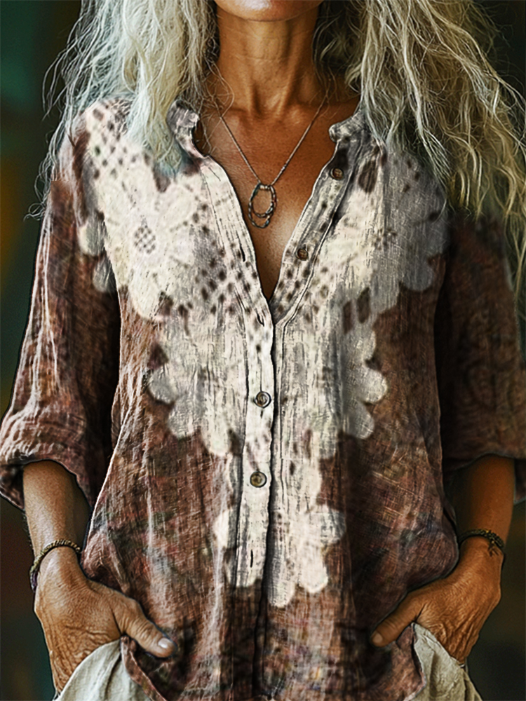 Women's Vintage Lace Floral Art Print Casual Cotton Linen Shirt