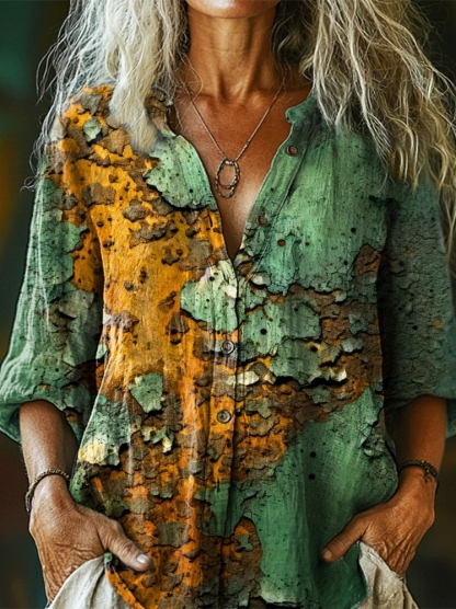 Women's Vintage Rust Textured Art Print Casual Cotton Shirt