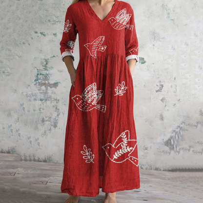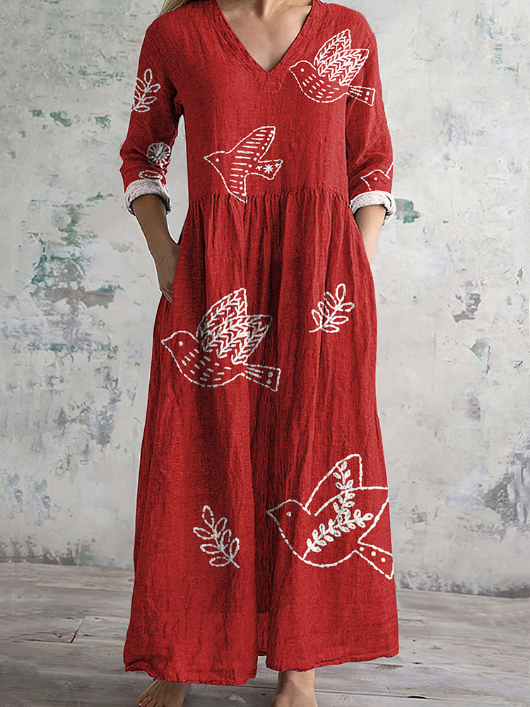 Flower And Bird Print V-neck Linen Blend Midi Dress