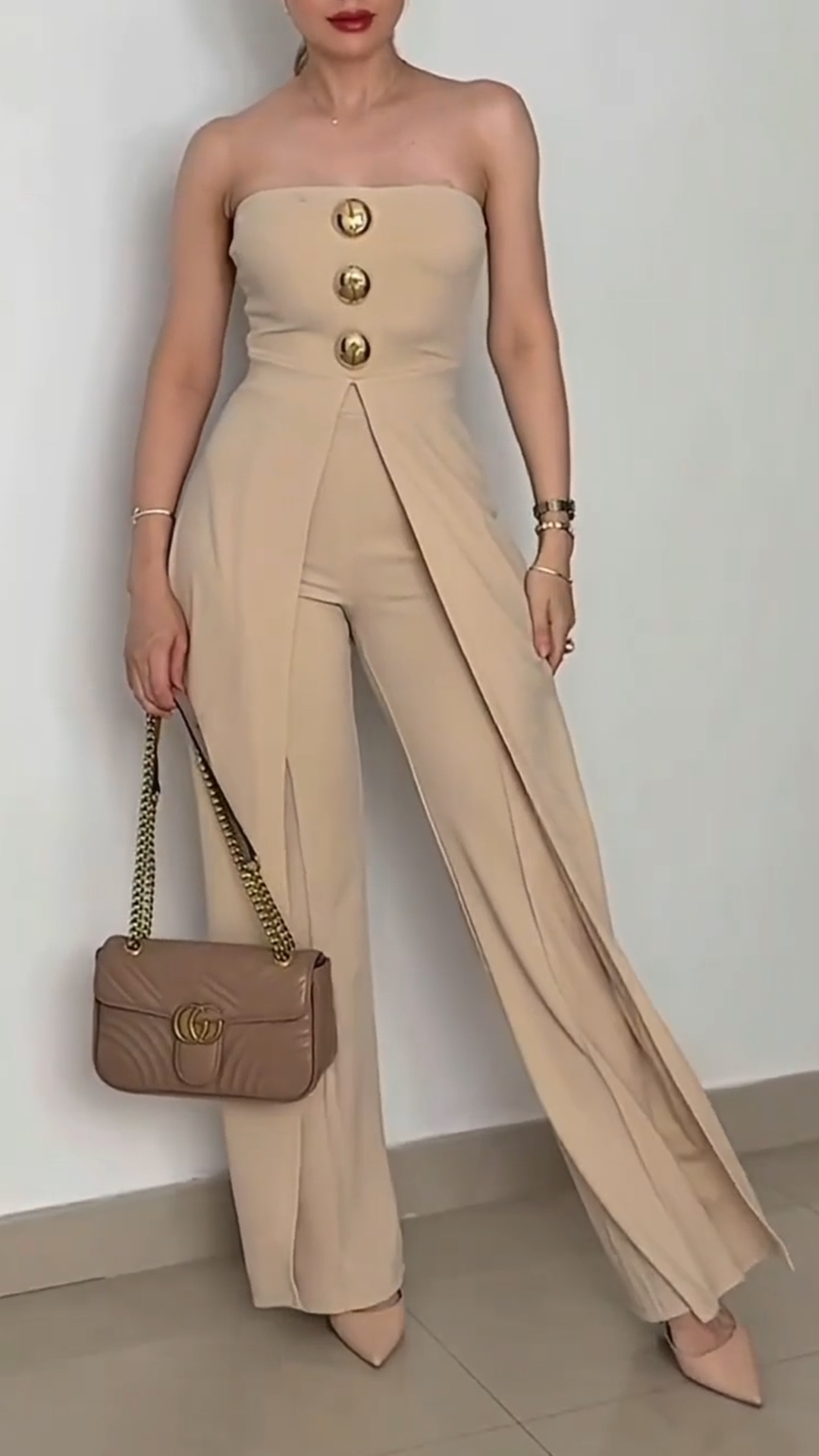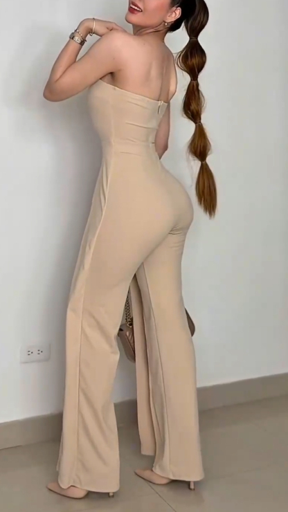“Golden Hour Glam” Command attention in this chic one-shoulder jumpsuit that redefines effortless elegance. Featuring a sculpted bodice with statement gold medallion buttons cascading down an asymmetrical flap, this tailored piece is both bold and sophisticated. The wide-leg silhouette elongates the figure, while the soft, creamy hue adds a touch of minimalist luxury. Whether you're heading to a rooftop soirée or making your mark at a cocktail event, this jumpsuit is your golden ticket to standout style.
