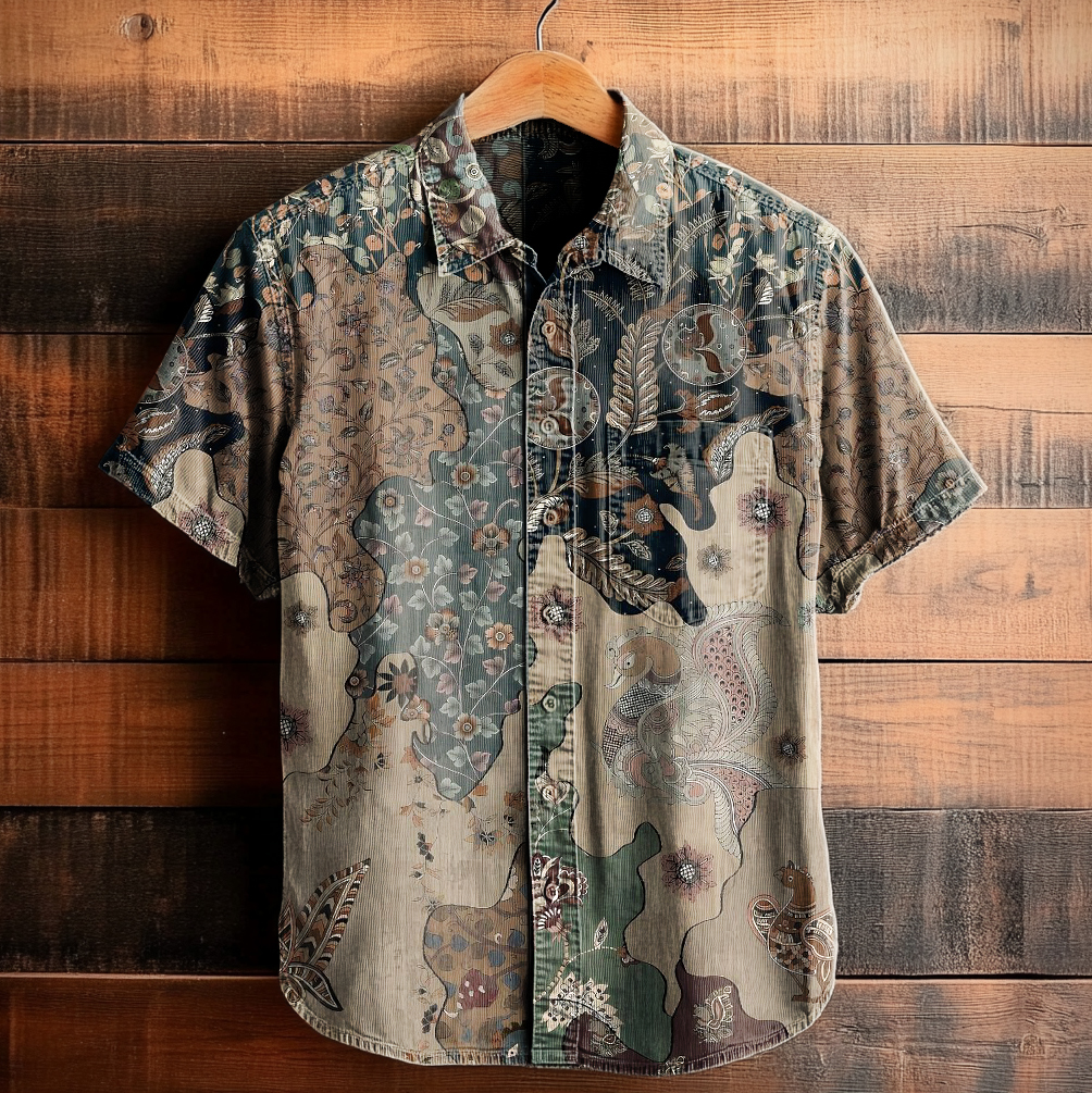 Men's Artistic Floral Ethnic Style Retro Stitching Print Lapel Shirt