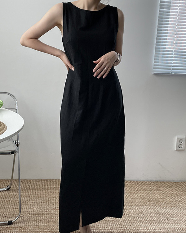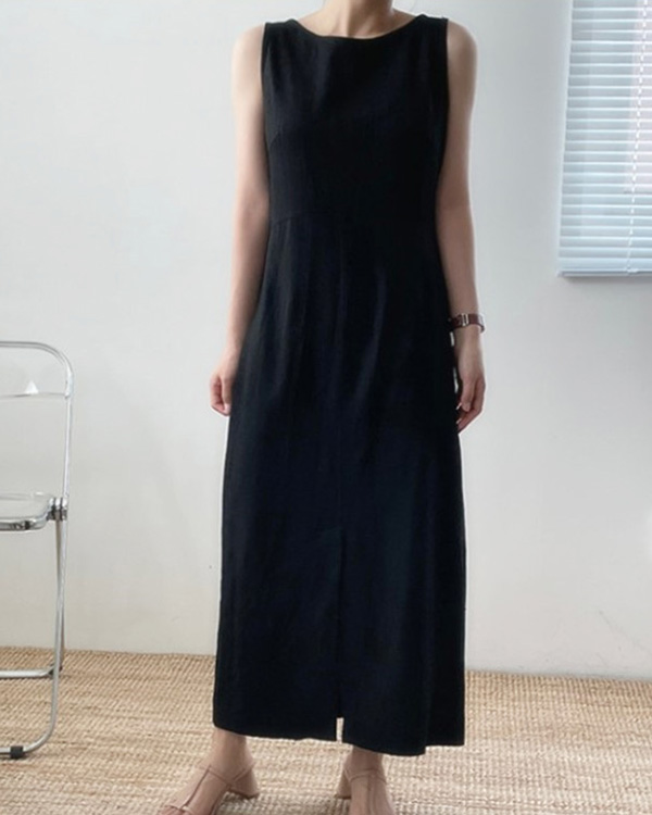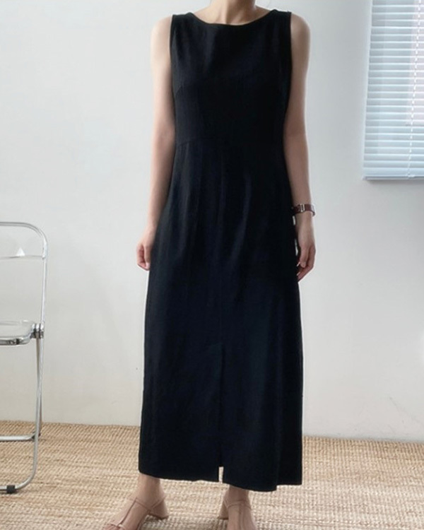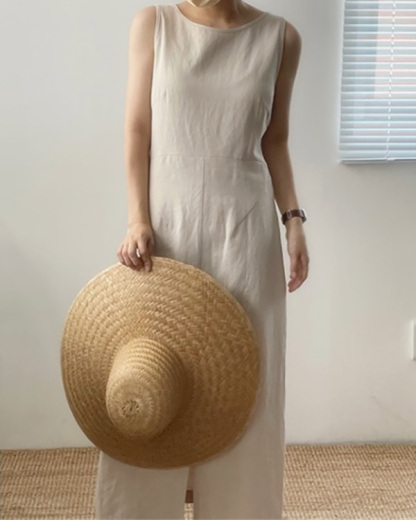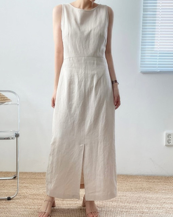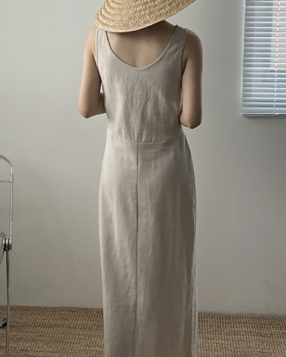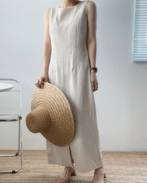 Solid Color Simple Round Neck Sleeveless Cotton Linen Dress