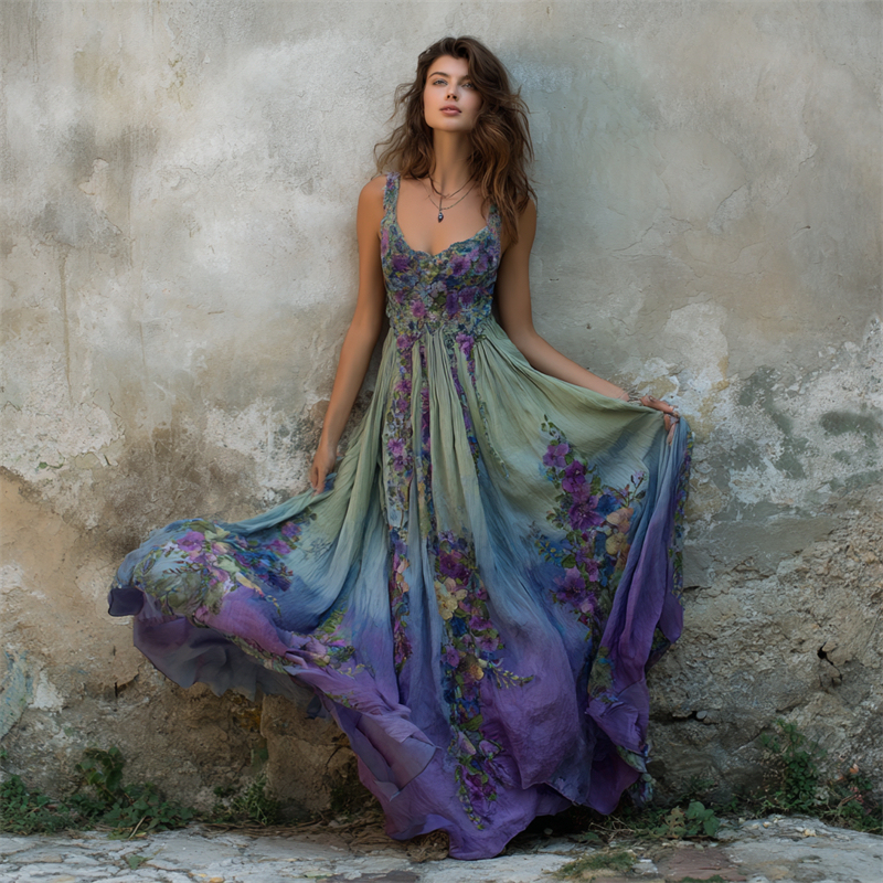 Vintage Floral Embroidered Purple Gradient Flowy Linen Maxi Dress
