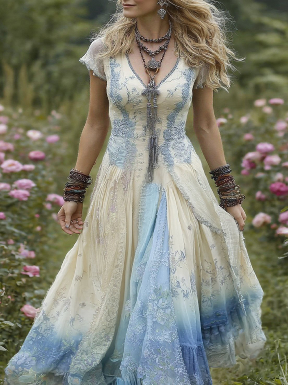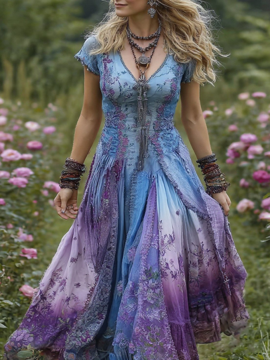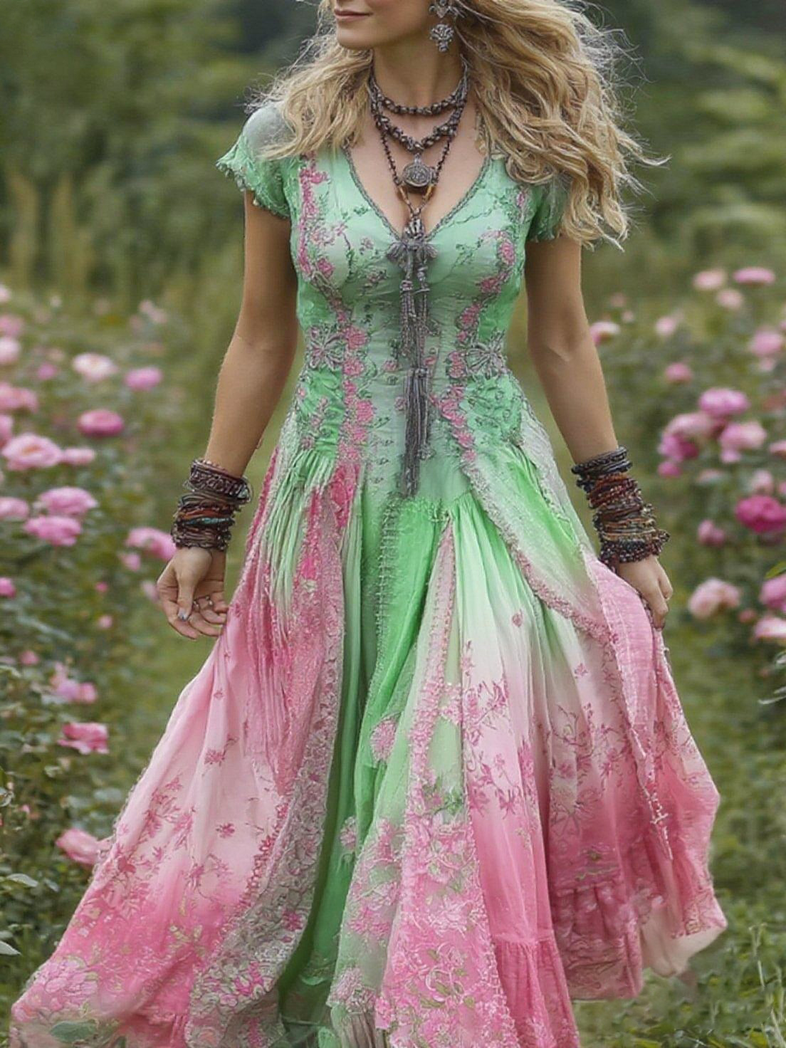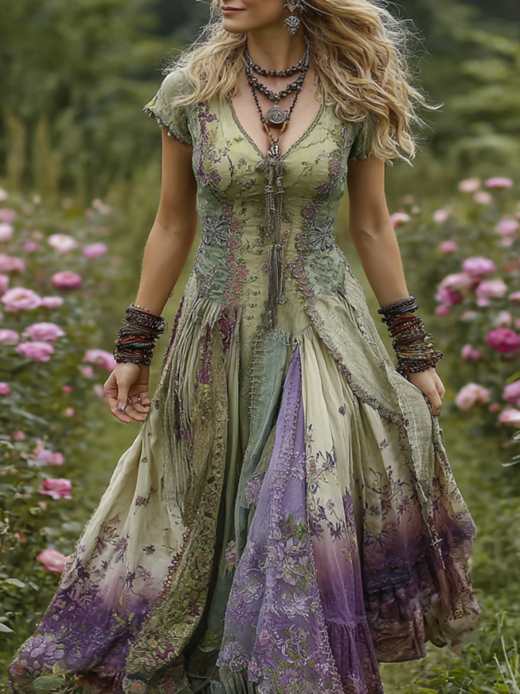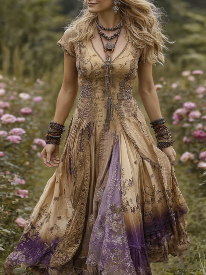 Vintage Gradient Purple Floral Embroidered Linen Maxi Dress