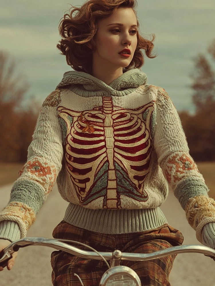 Vintage Halloween Skeleton Art Knit Cozy Hooded Sweater