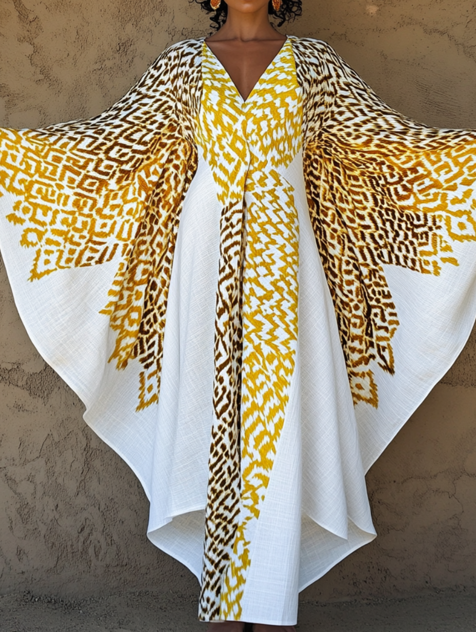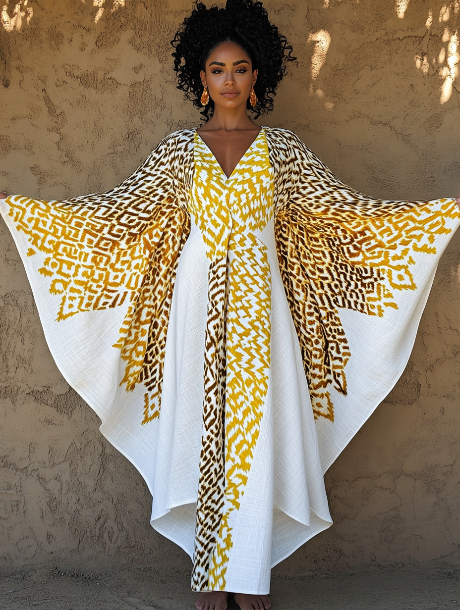 Women's Gold Art Print Linen V-Neck Robe