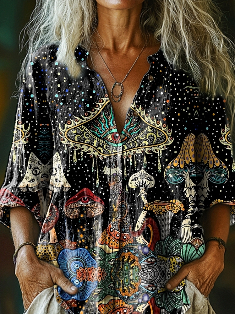 Women's Hippie Mushroom Art Print Casual Cotton And Linen Shirt