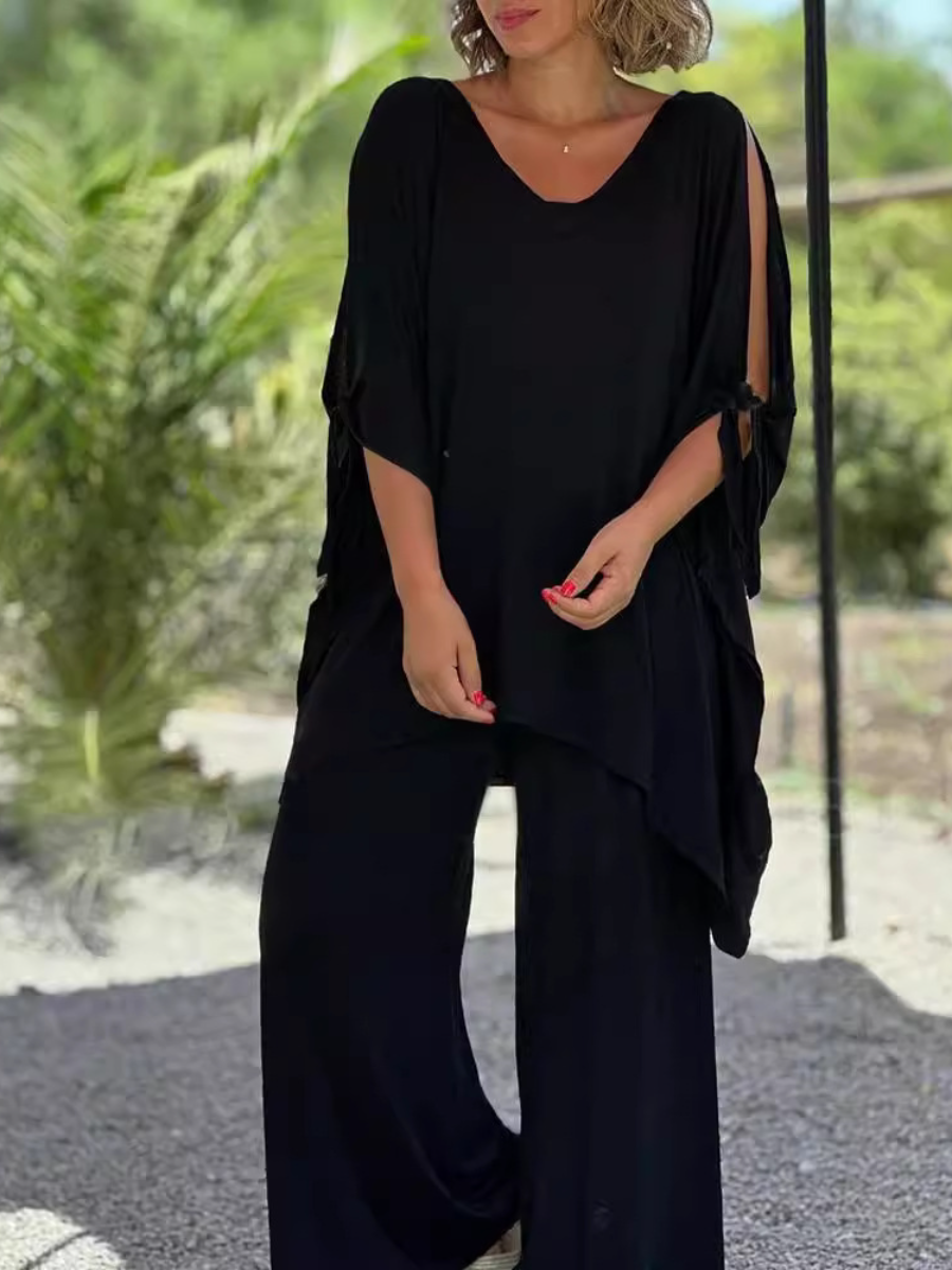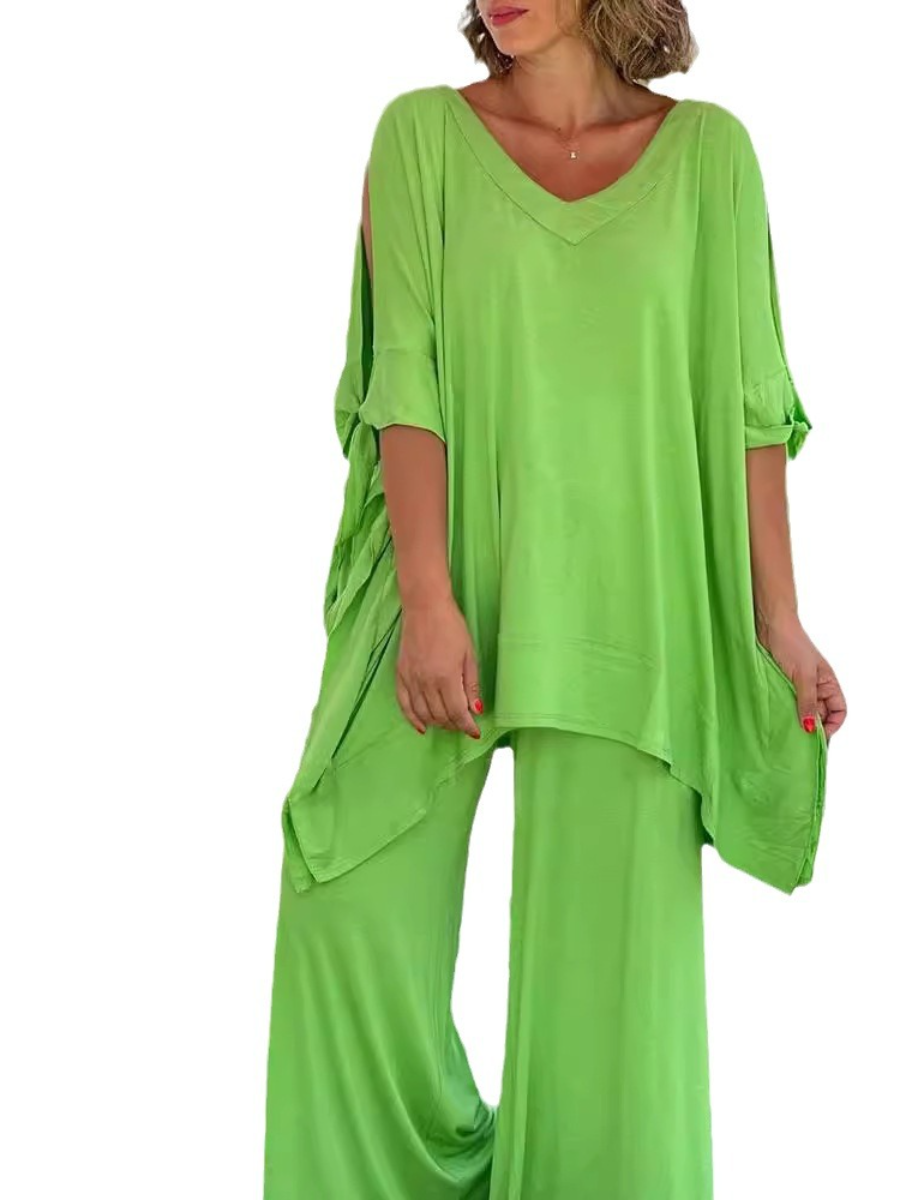 Women's Summer V-neck Solid Color Pants Wide Leg Suit
