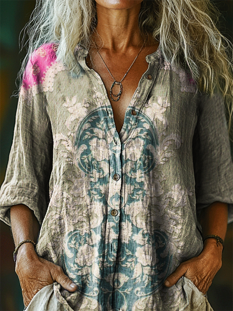 Women's Vintage Bohemian Floral Art Print Casual Cotton Linen Shirt