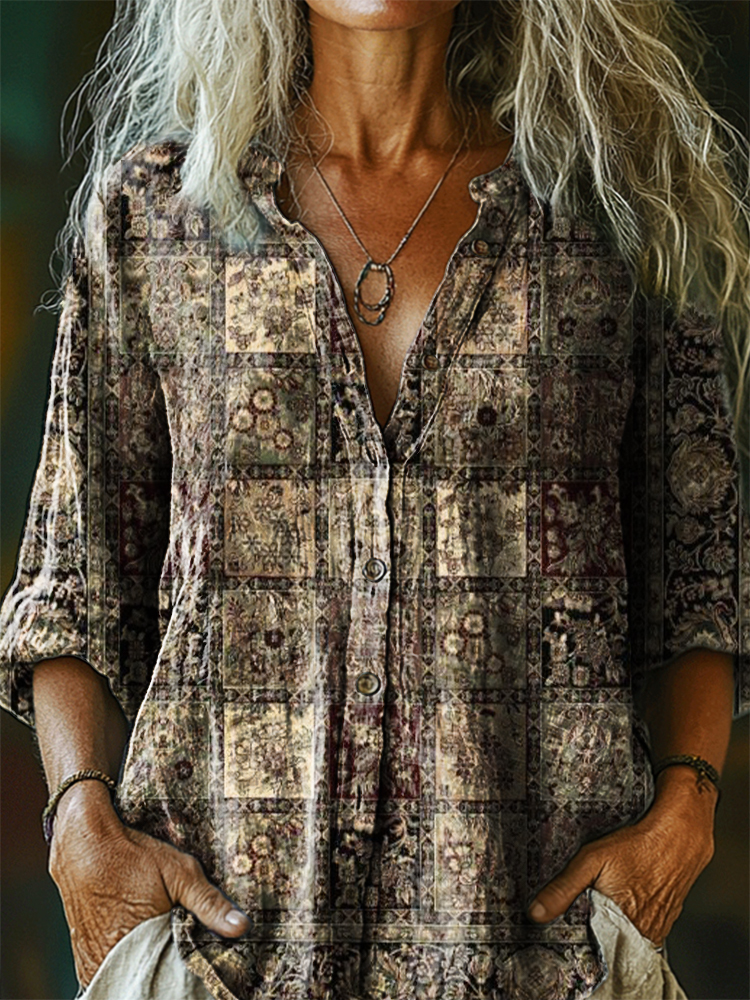 Women's Vintage Ethnic Floral Art Print Casual Cotton Linen Shirt