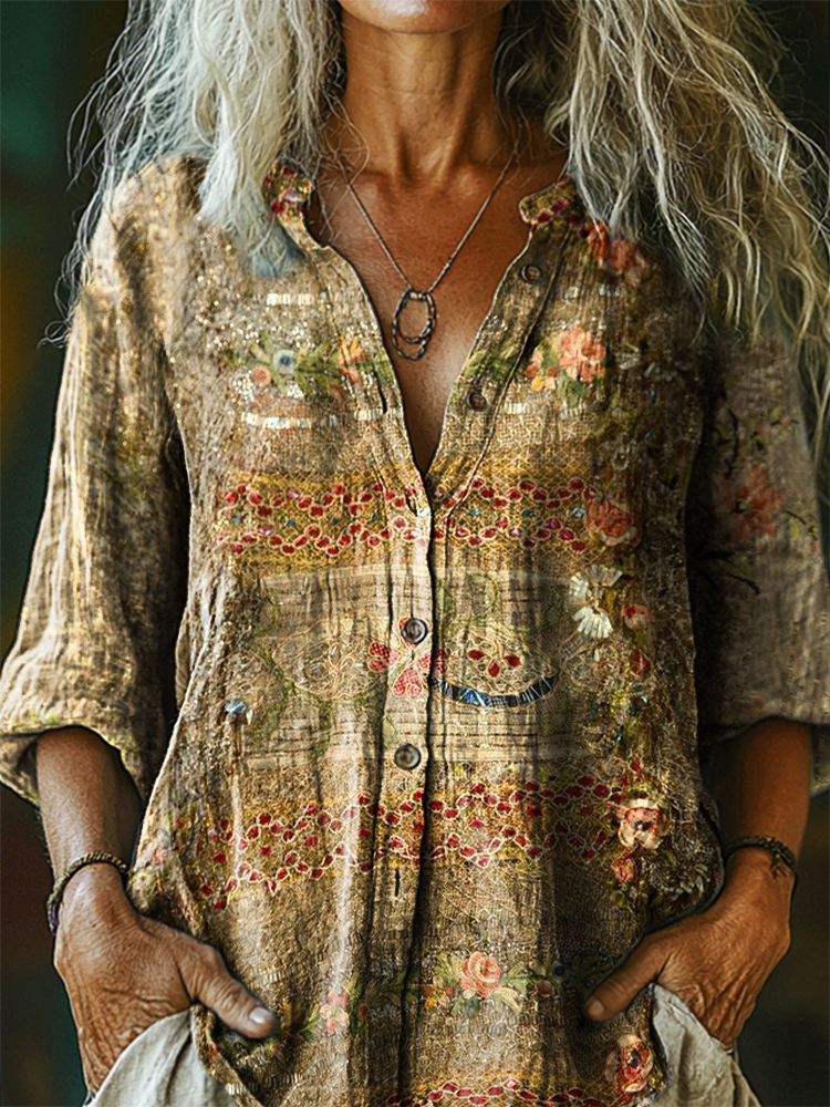 Women's Vintage Ethnic Floral Art Print Casual Cotton Linen Shirt