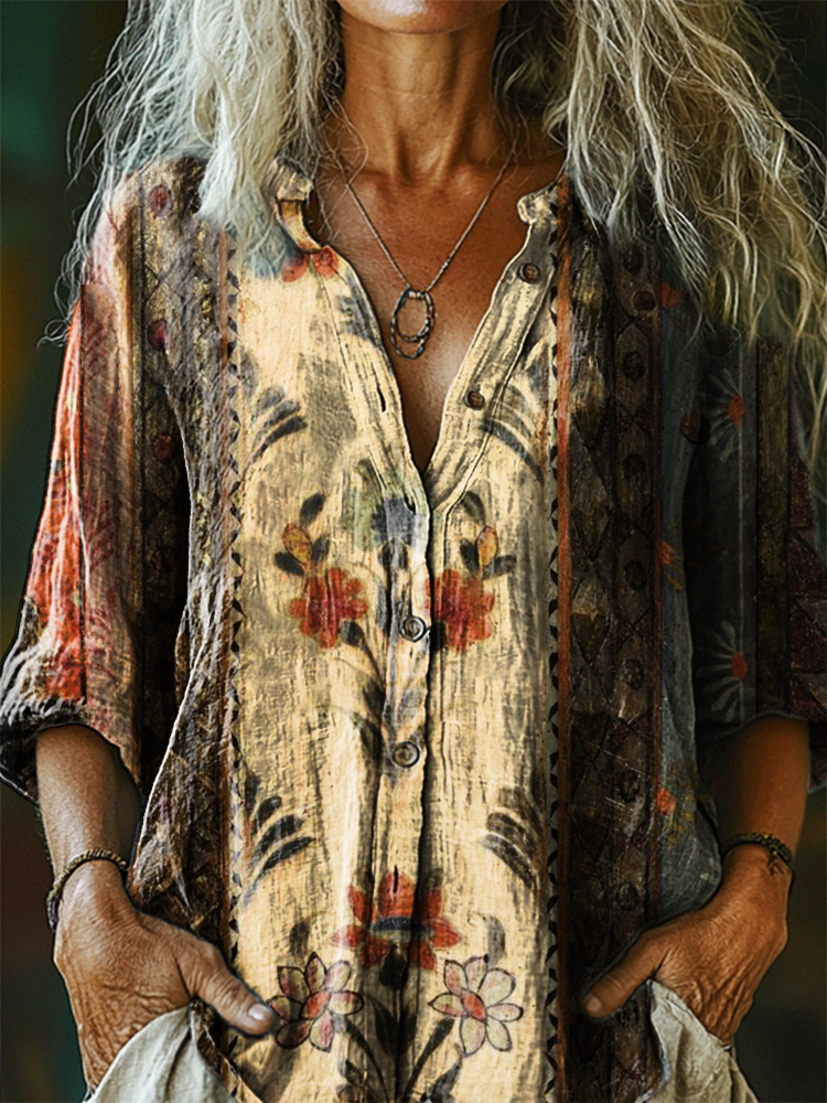 Women's Vintage Ethnic Floral Art Print Casual Cotton Linen Shirt