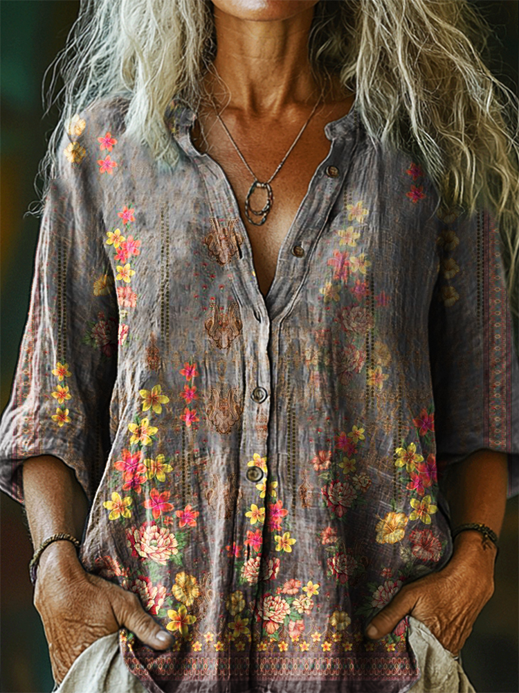 Women's Vintage Ethnic Floral Art Print Casual Cotton Linen Shirt