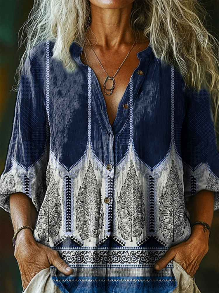 Women's Vintage Ethnic Tattoo Pattern Art Print Casual Cotton Linen Shirt