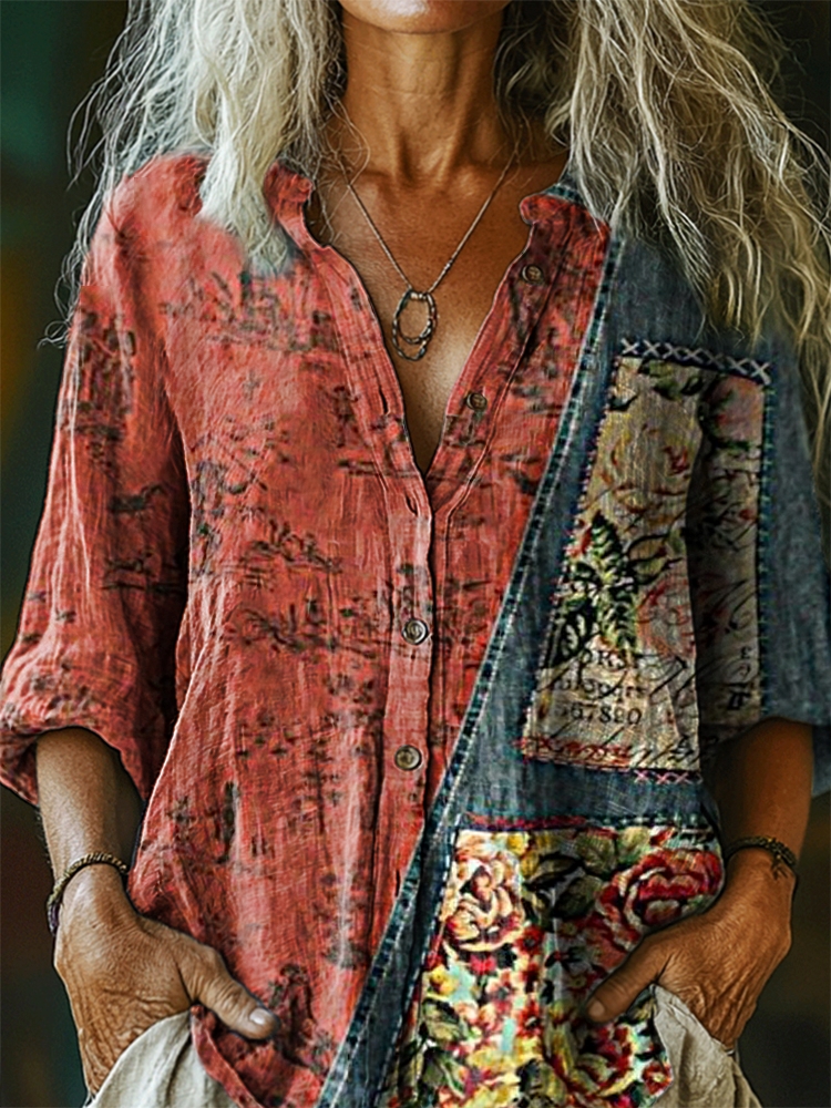 Women's Vintage Ethnic Tattoo Pattern Art Print Casual Cotton Linen Shirt