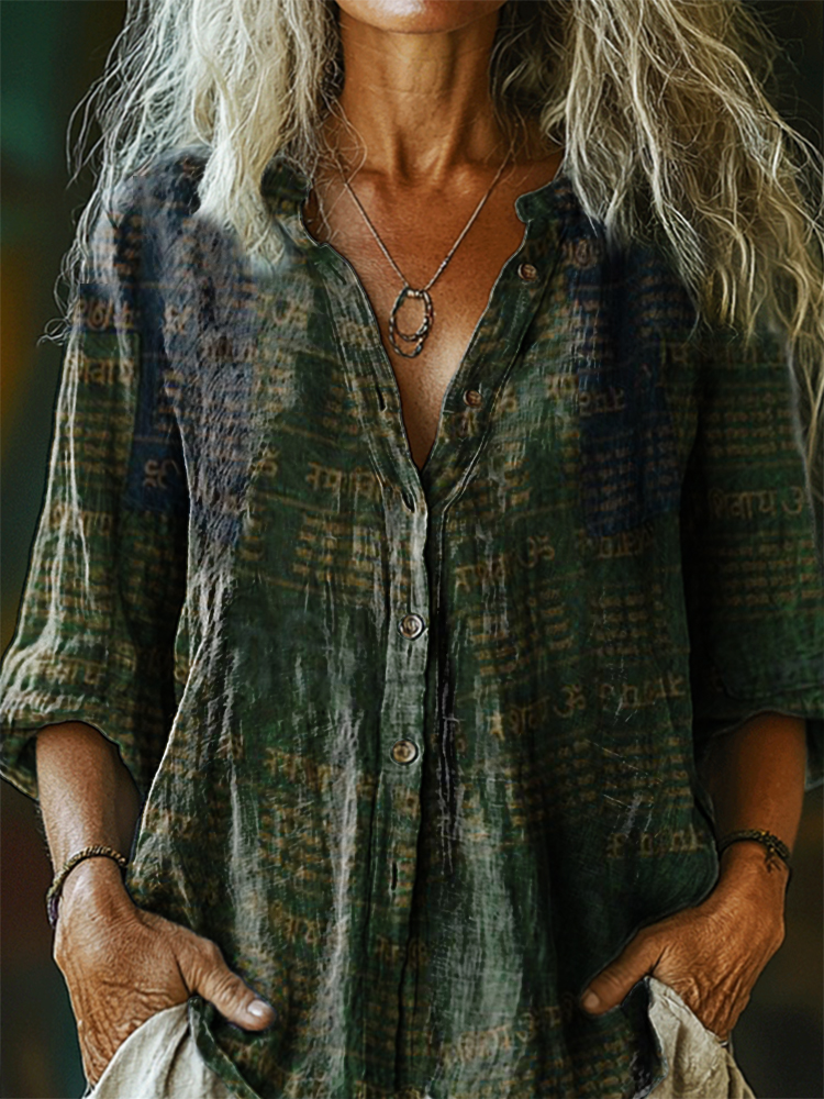 Women's Vintage Ethnic Tattoo Pattern Art Print Casual Cotton Linen Shirt