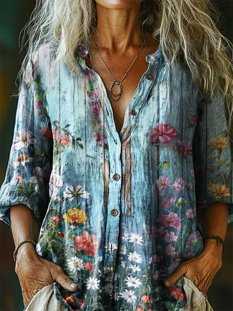 Women's Vintage Floral Art Print Casual Cotton Linen Shirt