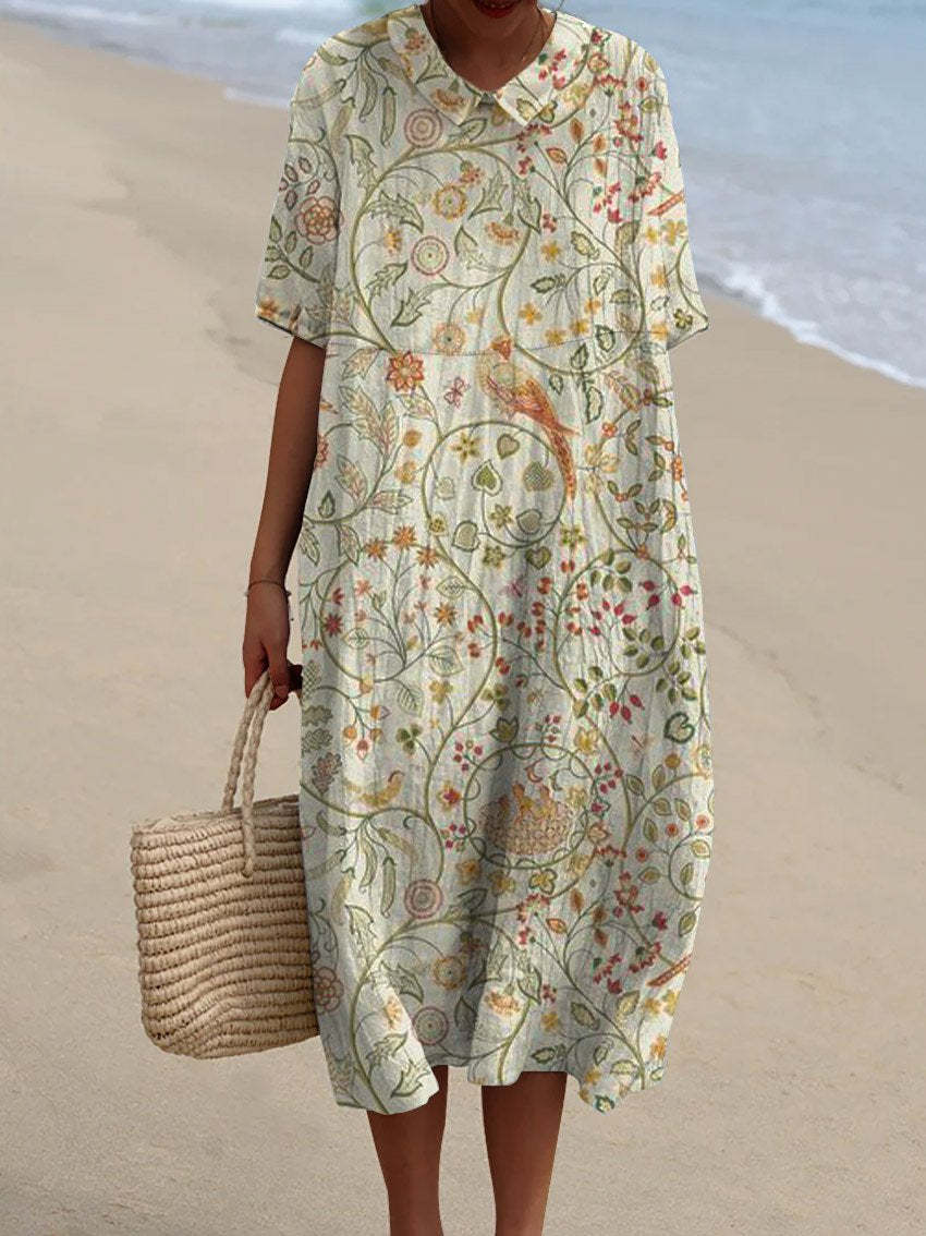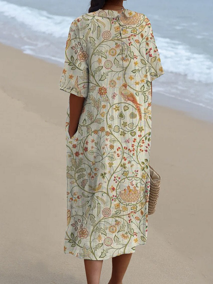 Women's Vintage Floral Art Print Pocket Linen Dress(Convertible Dress With Front And Back Option)