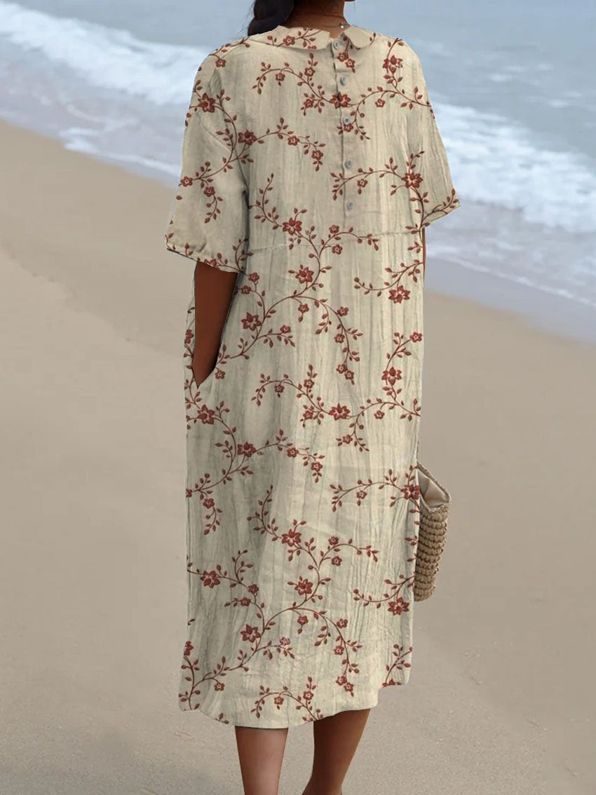 Women's Vintage Floral Art Print Pocket Linen Dress(Convertible Dress With Front And Back Option)