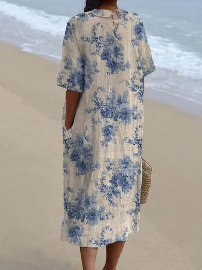 Women's Vintage Floral Art Print Pocket Linen Dress(Convertible Dress With Front And Back Option)