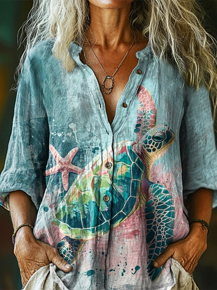 Women's Watercolor Turtle Art Pattern Print Casual Cotton Linen Shirt
