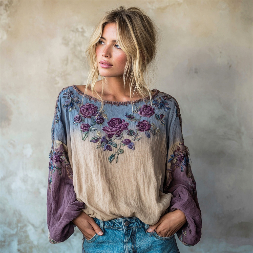Boho Romantic Floral Embroidery Gradient Women's Linen Loose Shirt