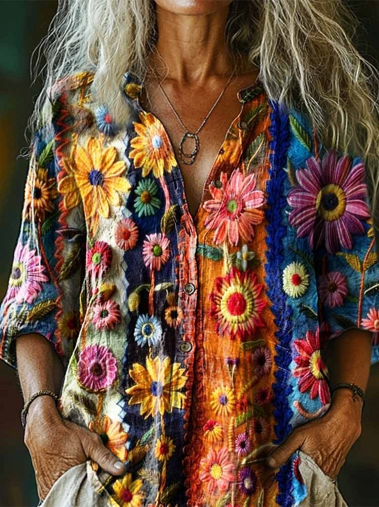 Women's Boho Retro 3D Floral Art Pattern Print Casual Cotton Linen Shirt