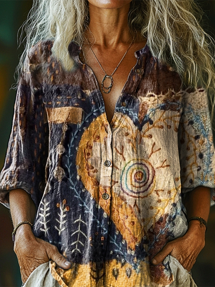 Women's Retro Ethnic Heart Collage Art Pattern Print Casual Cotton Linen Shirt
