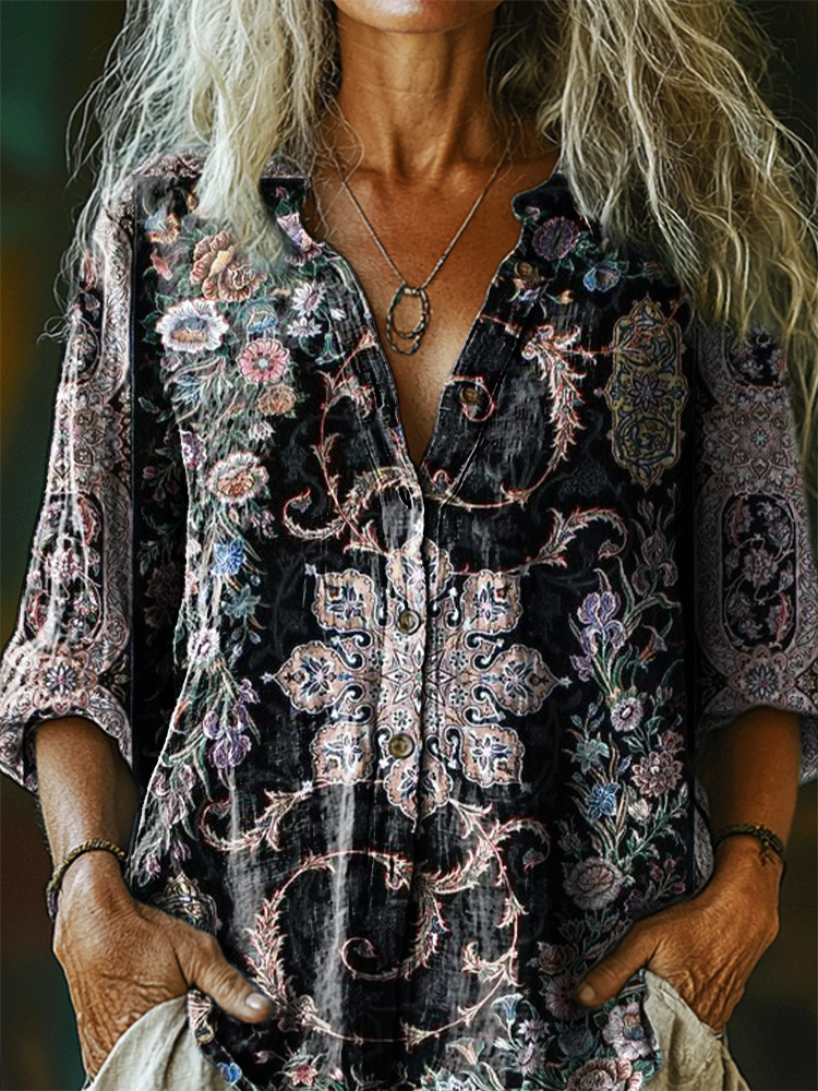 Women's Vintage Ethnic Floral Art Print Casual Cotton Linen Shirt