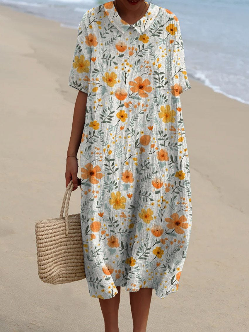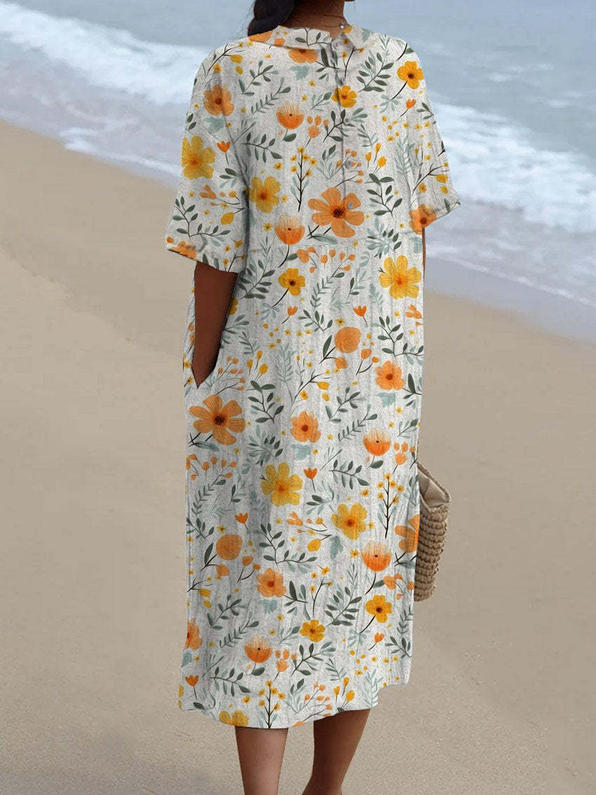 Women's Vintage Floral Art Print Pocket Linen Dress(Convertible Dress With Front And Back Option)