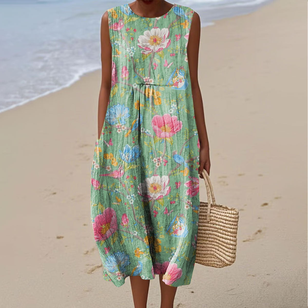 Women's Vintage Flower Art Print Sleeveless Cotton Pocket Wrap Dress