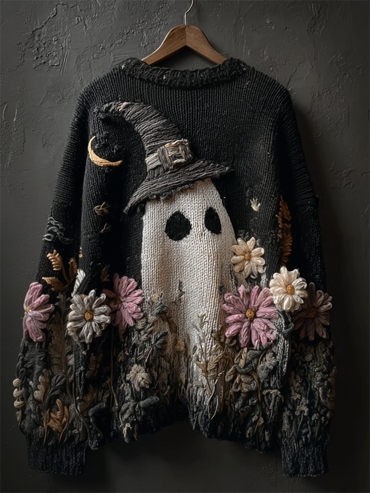 Halloween Lovely Witch Hat Ghost Floral Cozy Knit Sweater