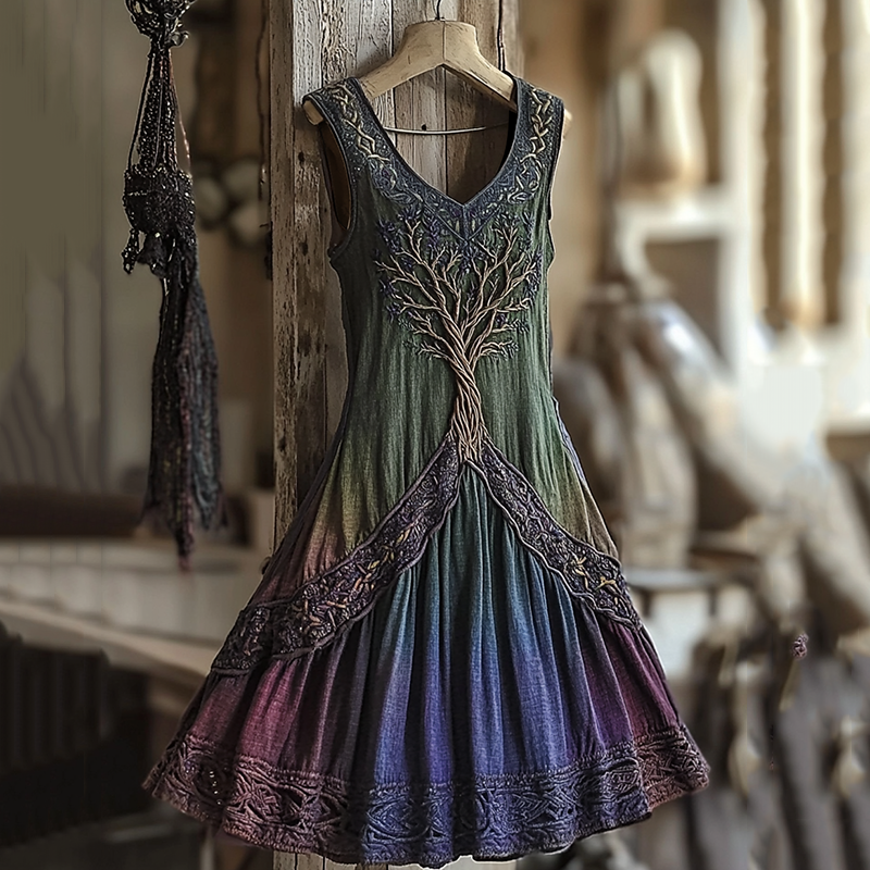 Women's Vintage Viking Tree Of Life Gradient Art Linen Waist Short Midi Dress