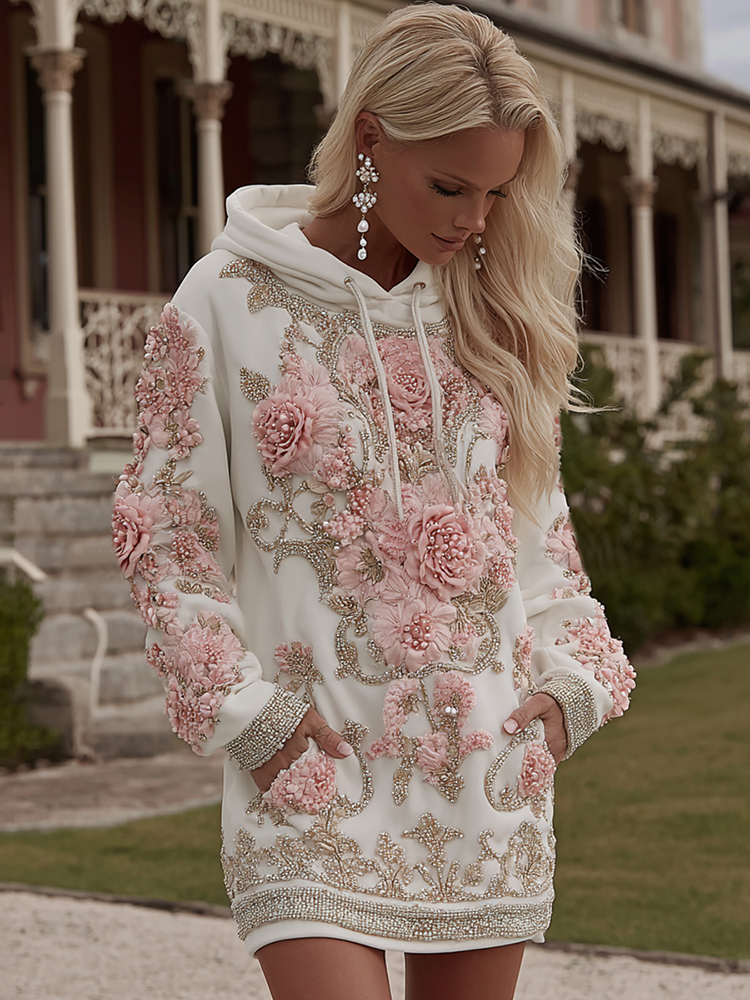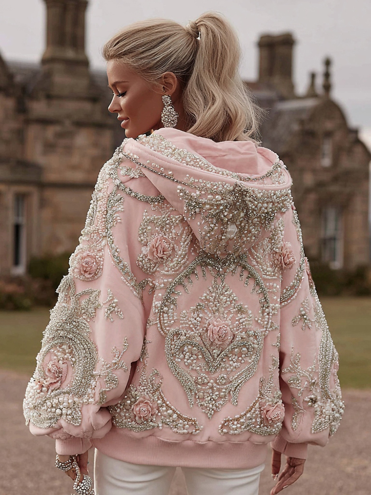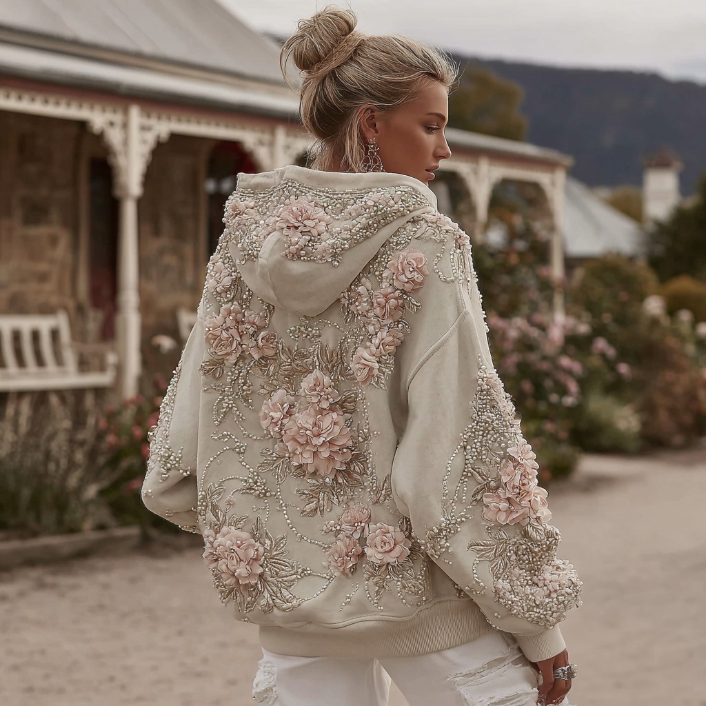 Women's Vintage Rose Pearl Embroidery Comfortable Warm Hoodie