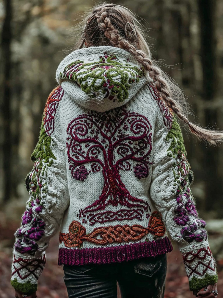 Women's Vintage Viking Celtic Knot Tree Of Life Art Knit Zip-up Hooded Sweater