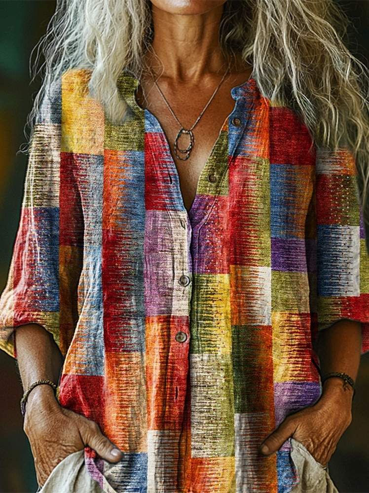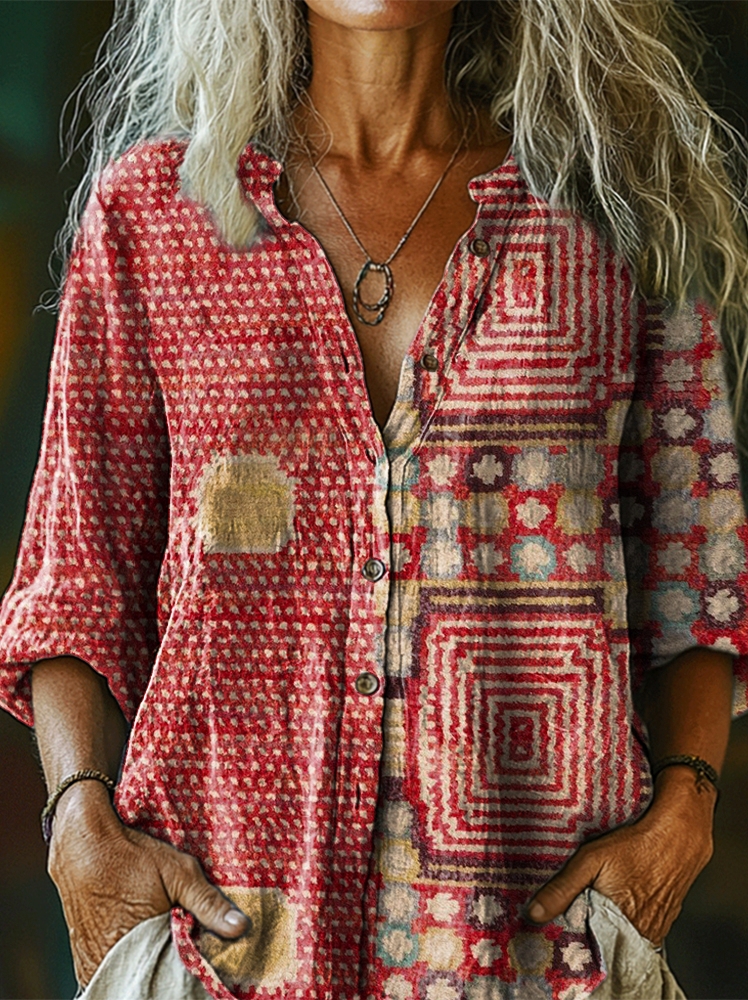 Patchwork Pattern Art Print Cotton Linen Casual Women's Shirt
