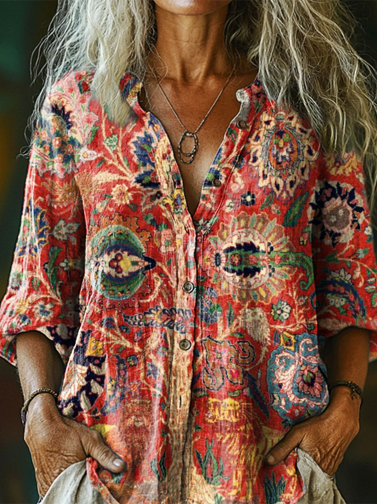 Women's Vintage Folk Art Print Casual Cotton Linen Shirt