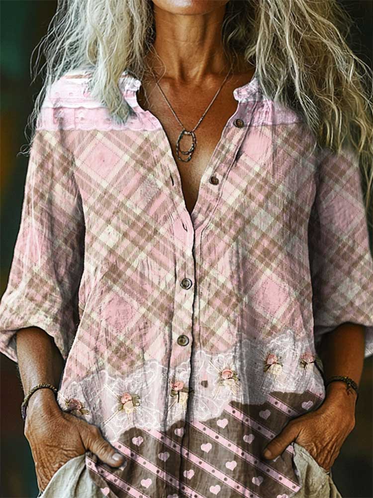 Plaid Love Floral Patchwork Pattern Art Print Cotton Linen Casual Women's Shirt