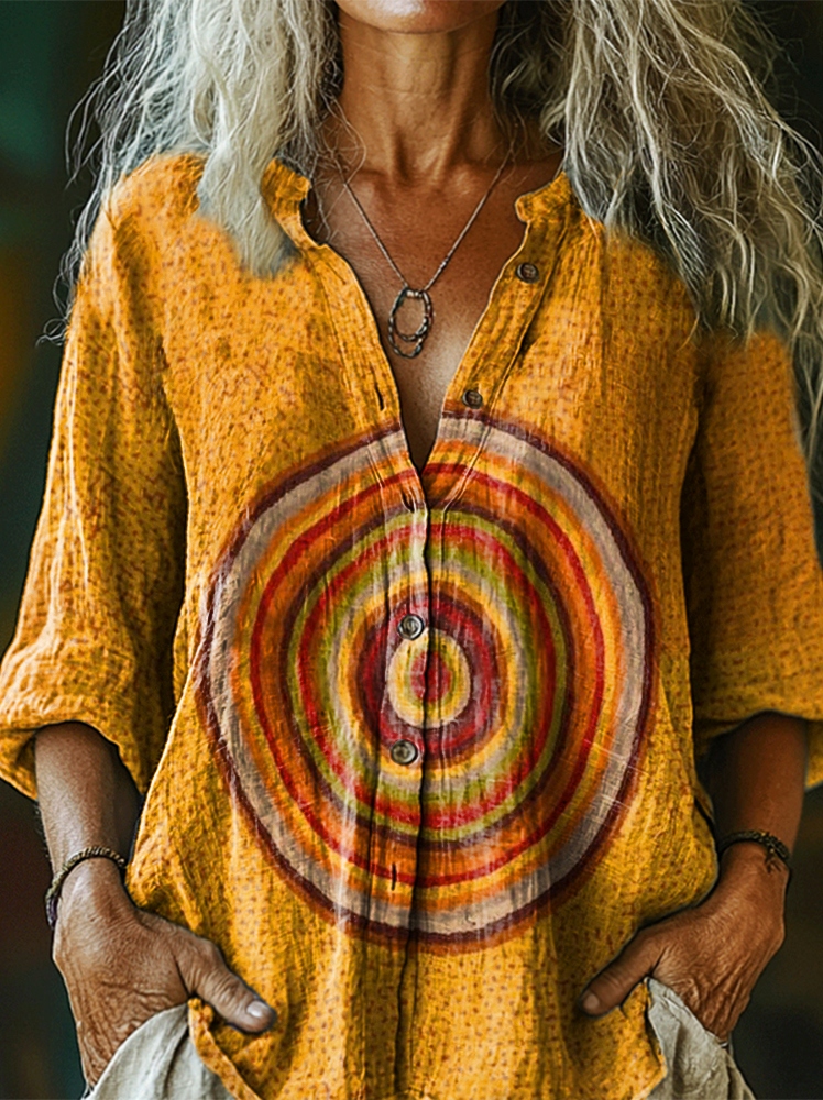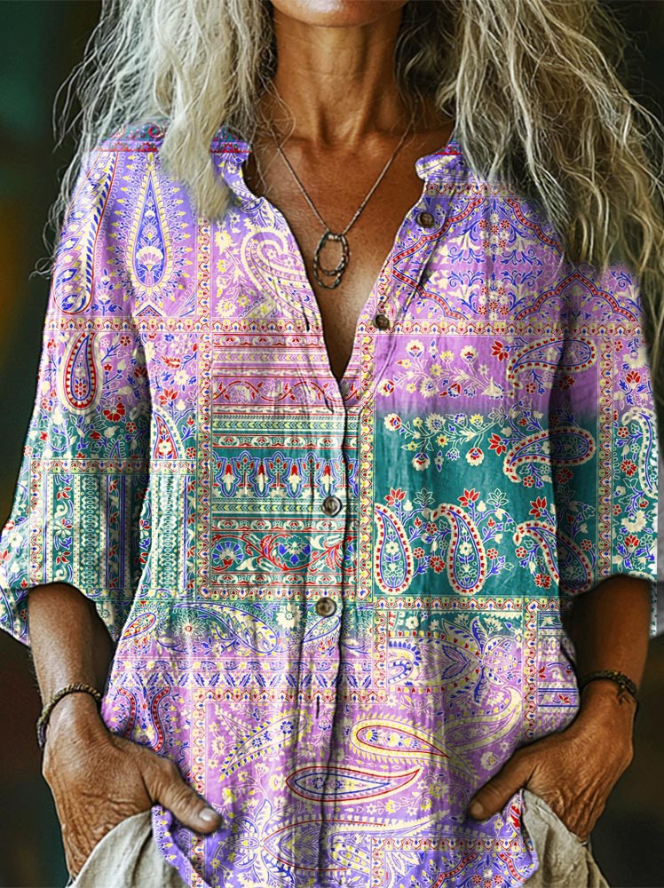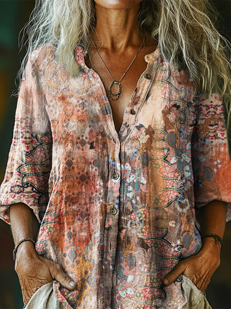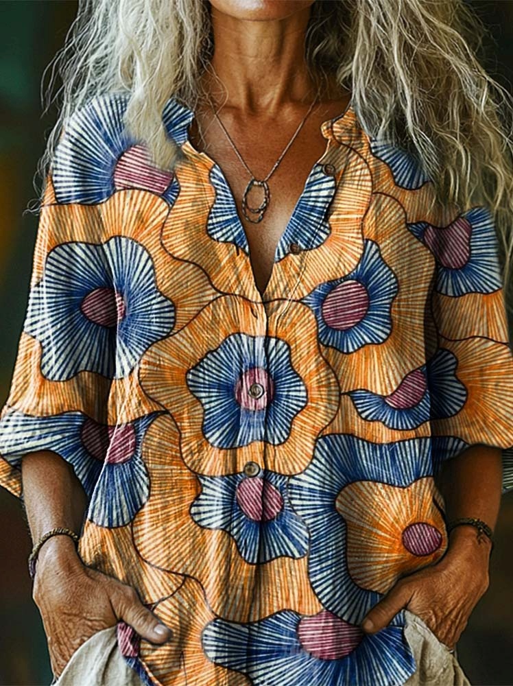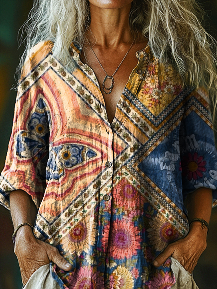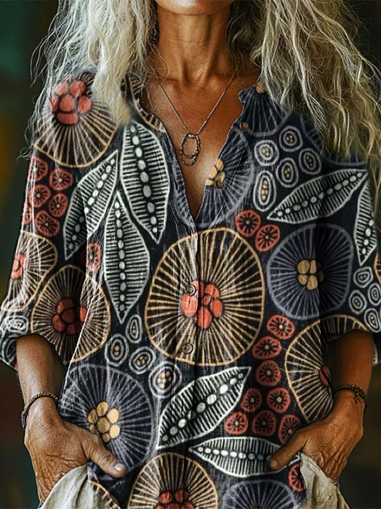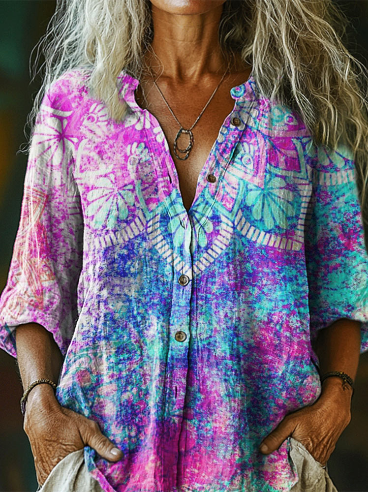 Women's Bohemian Art Print Casual Cotton Linen Shirt