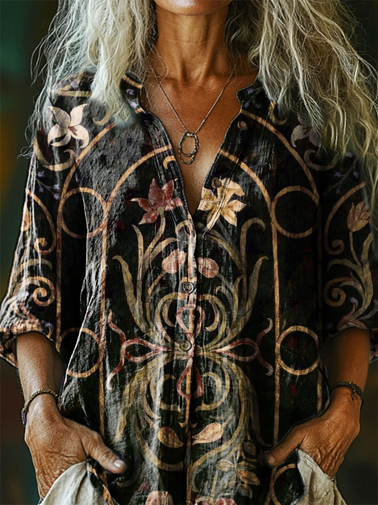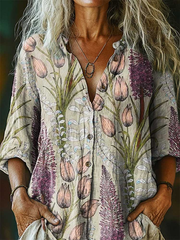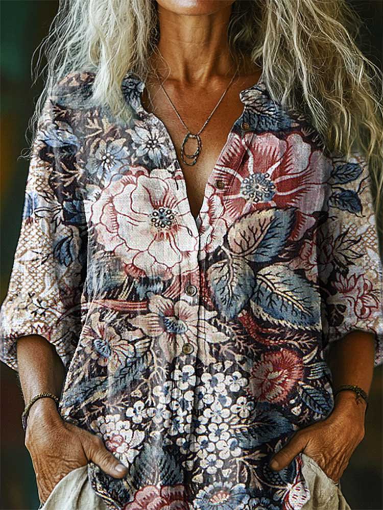 Women's Vintage Floral Art Print Casual Cotton Linen Shirt