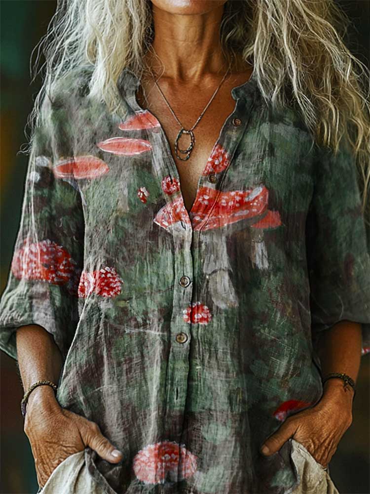 Mushroom Pattern Art Print Cotton Linen Casual Women's Shirt