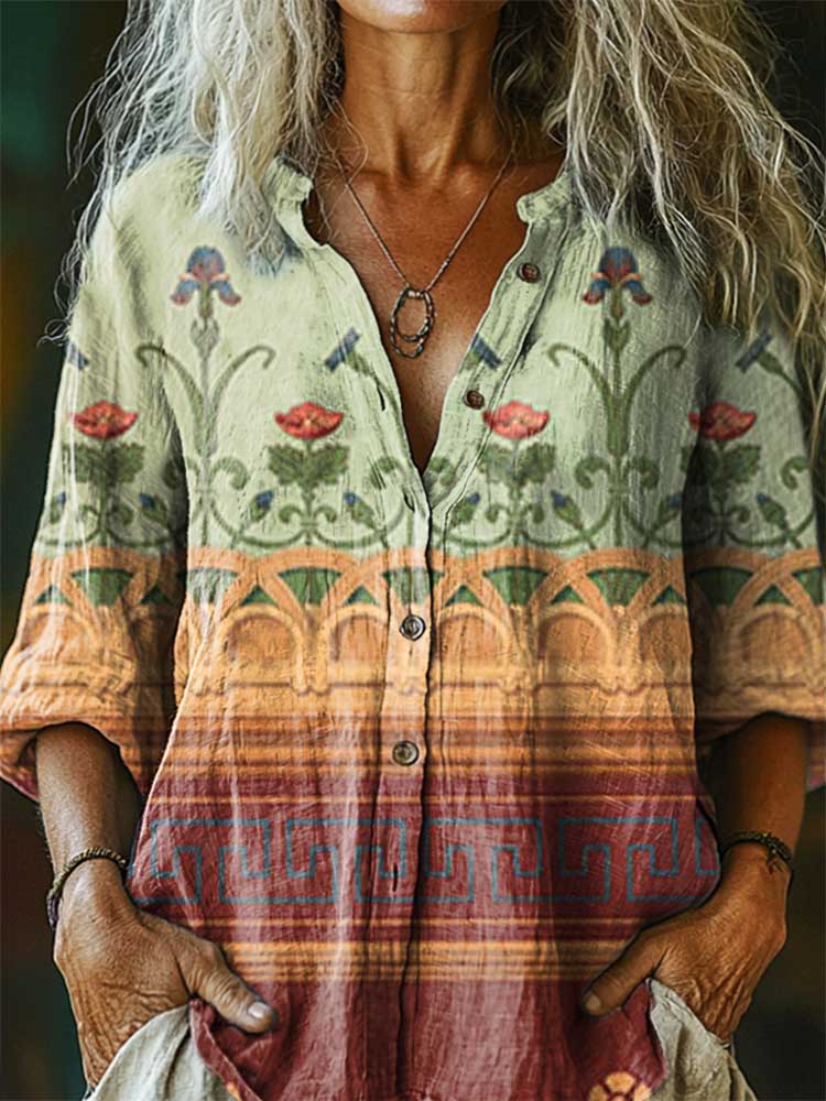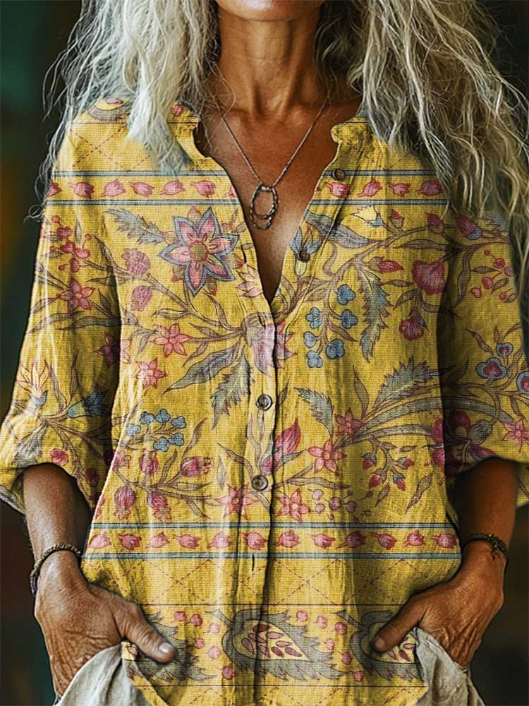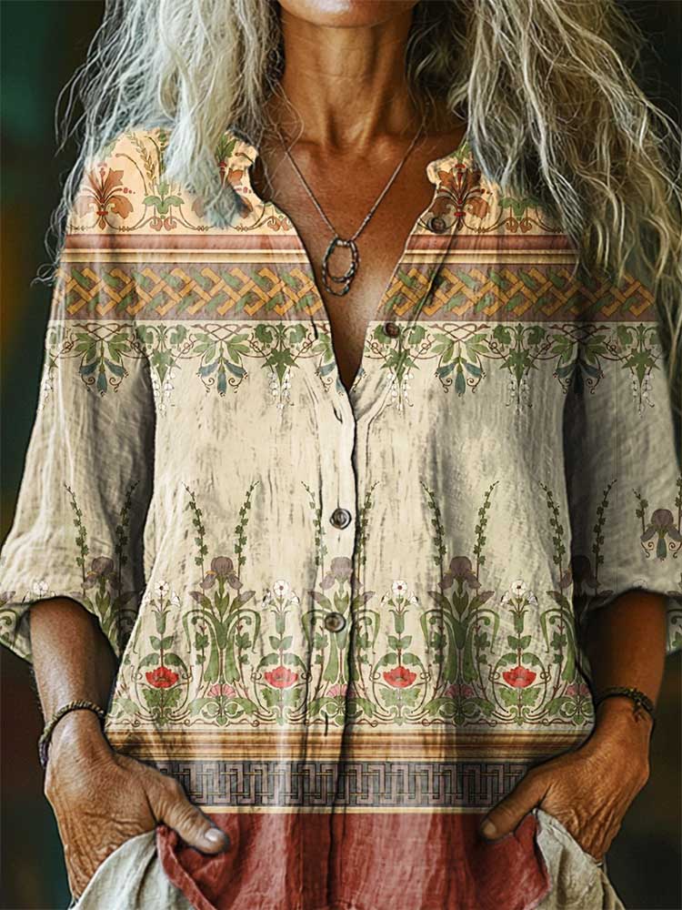 Women's Vintage Folk Floral Art Print Casual Cotton Linen Shirt