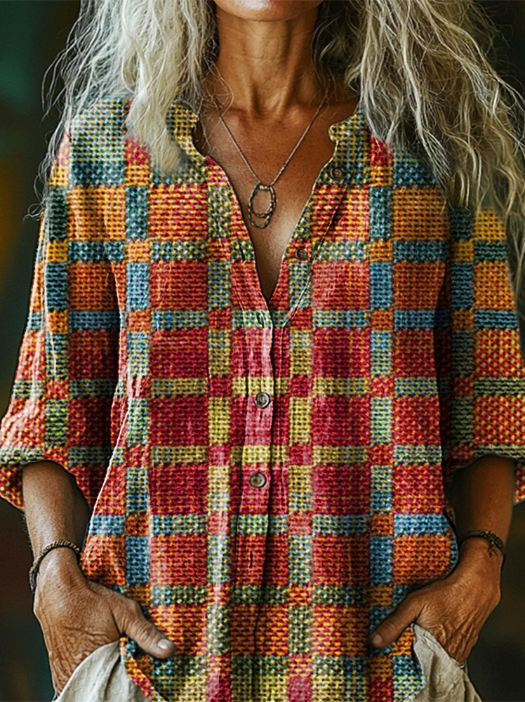 Women's Gradient Check Art Print Casual Cotton Linen Shirt