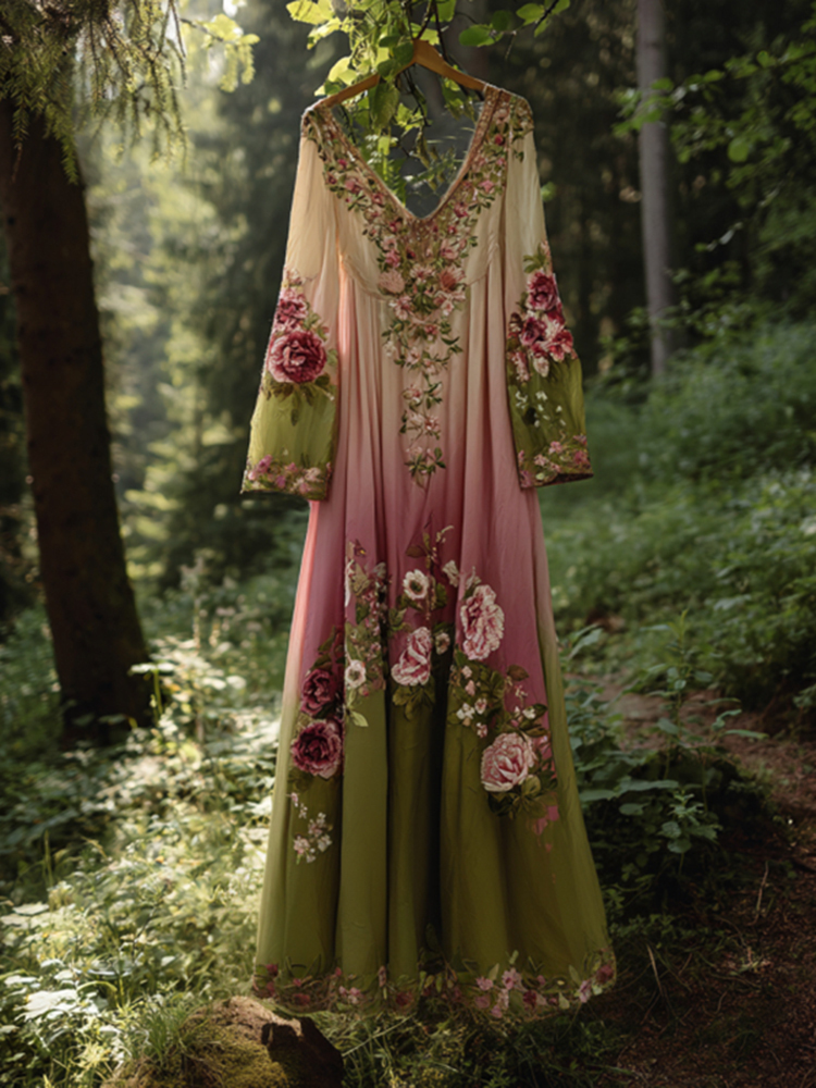 Classy Gradient Pink Roses Cancer Awareness Embroidered Linen Maxi Dress