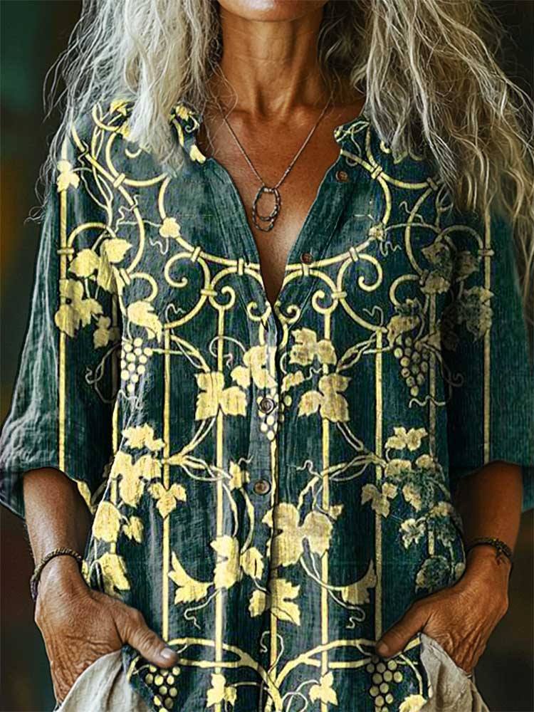 Floral Pattern Art Print Cotton Linen Casual Women's Shirt