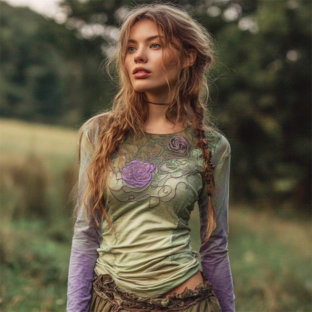 Vintage Purple Rose Embroidery Women's Gradient Long Sleeve Shirt