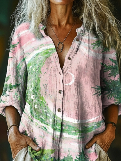 Women's Botanical Moon Pattern Art Print Casual Cotton Linen Shirt