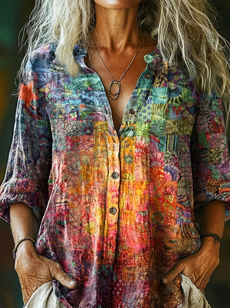 Women's Colorful Collage Art Print Casual Cotton Linen Shirt