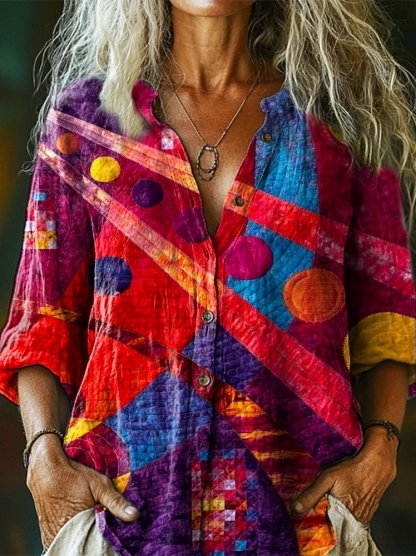 Women's Colorful Ethnic Patchwork Art Print Casual Cotton Linen Shirt