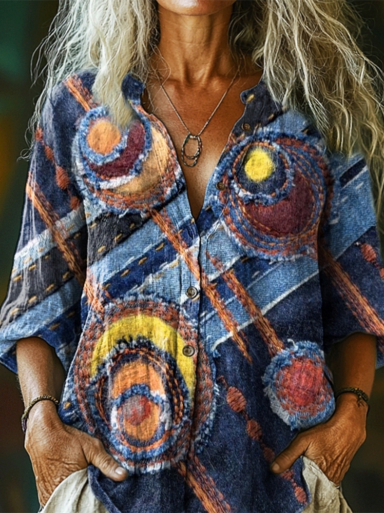 Women's Ethnic Patchwork Art Print Casual Cotton Linen Shirt